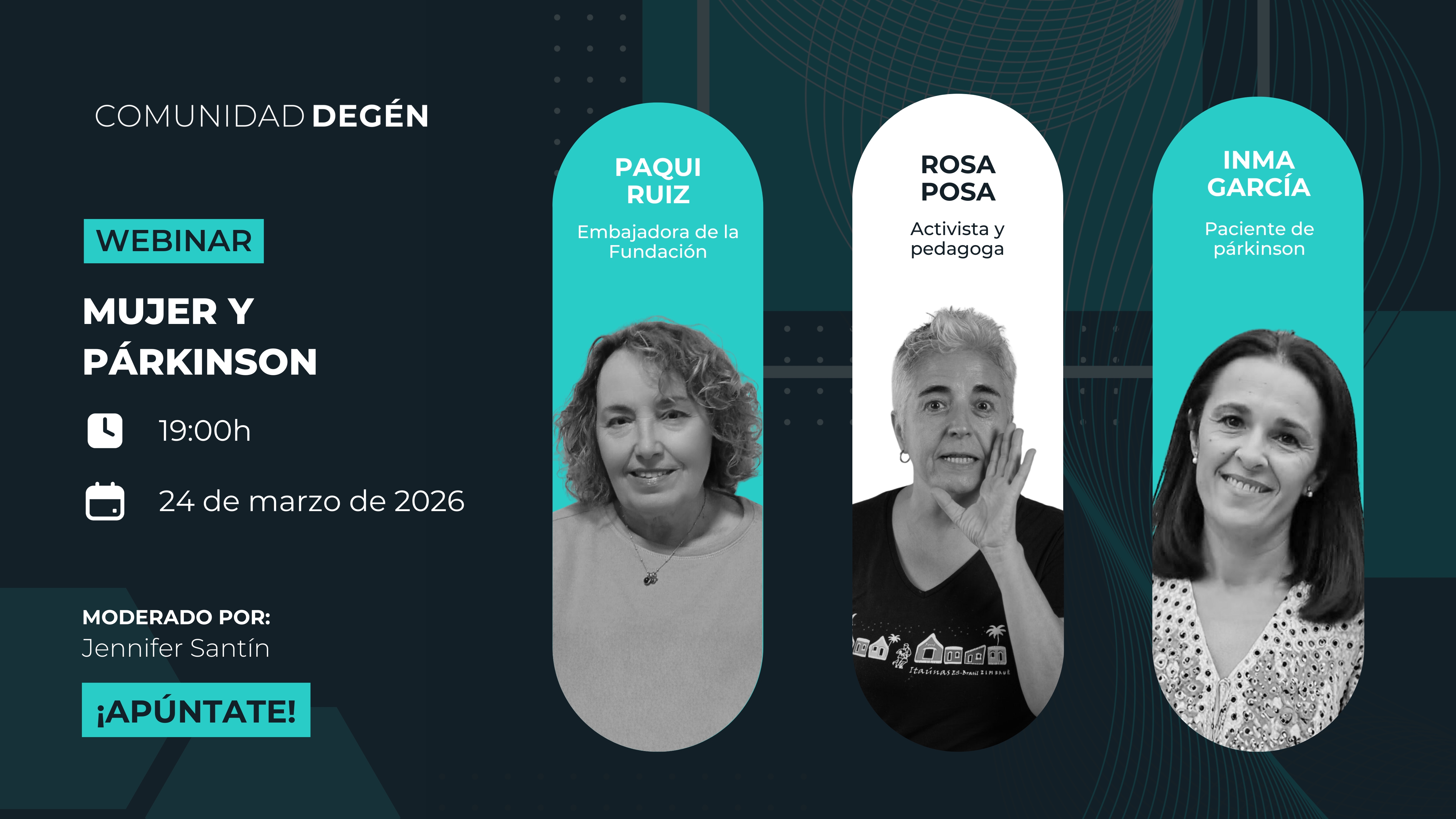Junto con Paqui Ruiz, Rosa Posa e Inma García, exploraremos cómo el párkinson afecta directamente en la vida de la mujer. No solo hablaremos acerca de los síntomas clínicos, sino también sobre la realidad emocional y diaria.